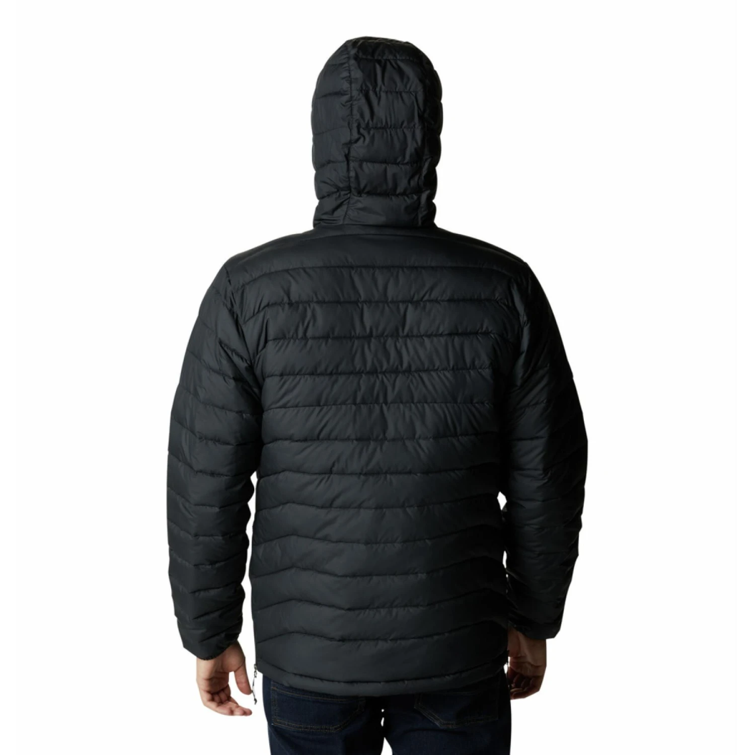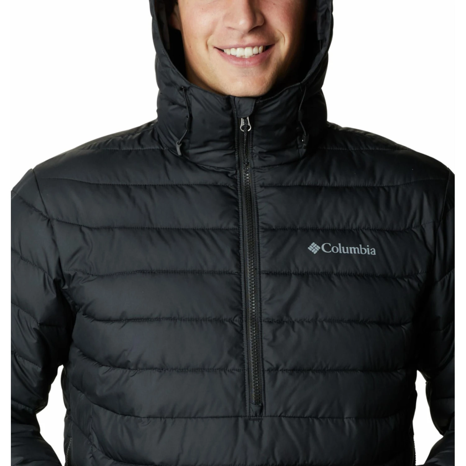 Drawstring adjustable hood.